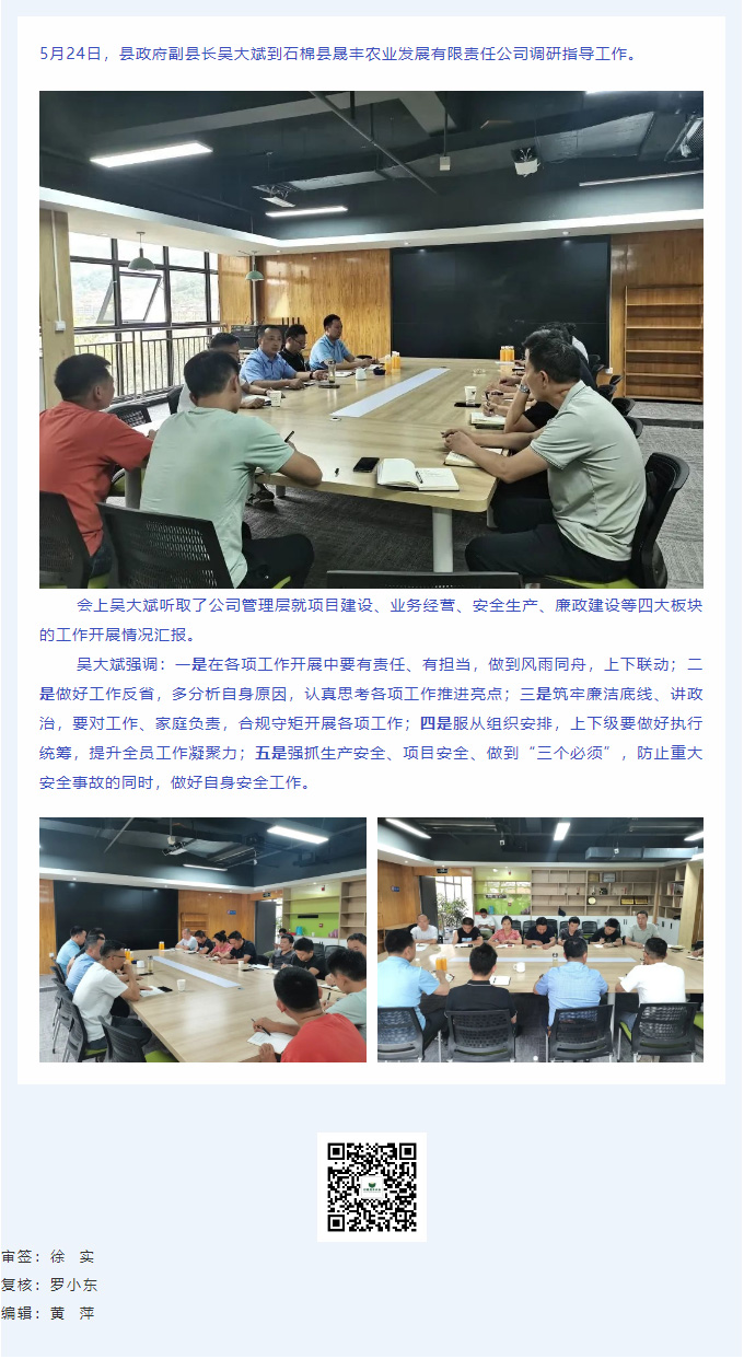 县政府副县长吴大斌到石棉县新航娱乐农业发展有限责任公司调研指导工作