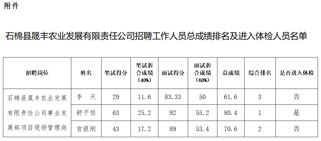 石棉县新航娱乐农业发展有限责任公司招聘事业发展部工作人员笔试、面试工作已结束,根据《石棉县新航娱乐农业发展有限责任公司招聘工作人员公告》规定,现将总成绩排名及进入体检人员名单予以公告,并将体检有关事宜公告如下。