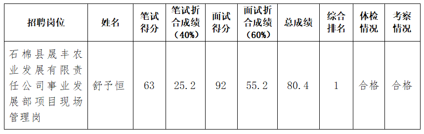 经公开报名、资格审查、笔试、面试、体检、考察程序,按照《石棉县新航娱乐农业发展有限责任公司招聘工作人员公告》相关规定,现将拟聘用人员名单进行公示: