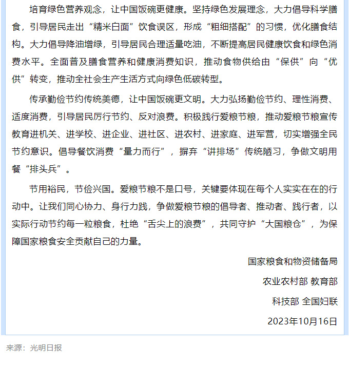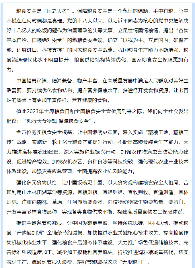 世界粮食日 | “践行大食物观 保障粮食安全”倡议书